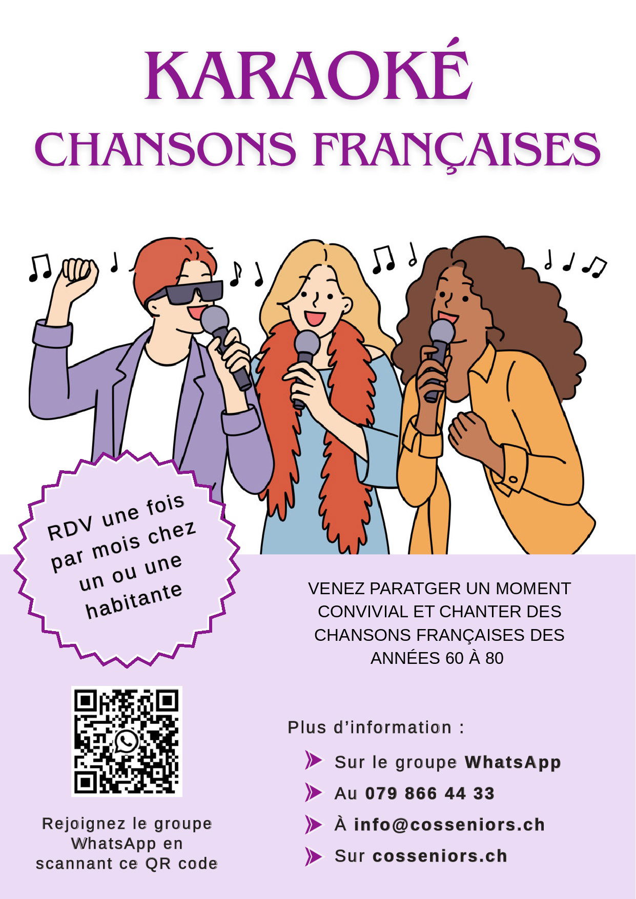 Partagez un moment convivial en chantant des chansons françaises des années 60 à 80. Si vous aimez la chanson française, si vous chantez des tubes des années 70 sous la douche, alors partagez vos talents (petits ou grands) au karaoké des séniors.